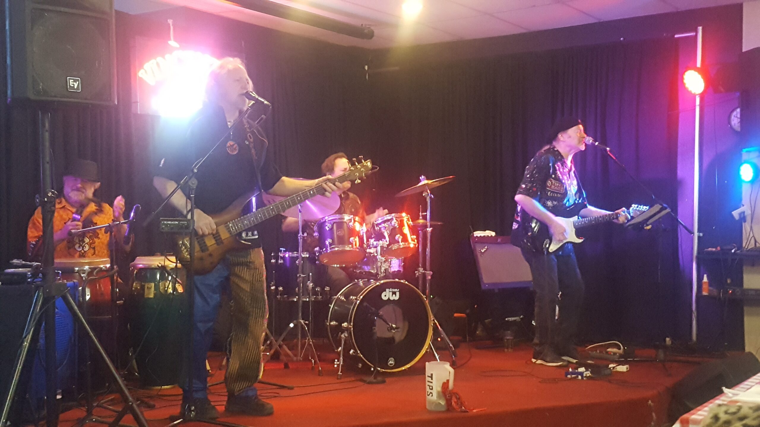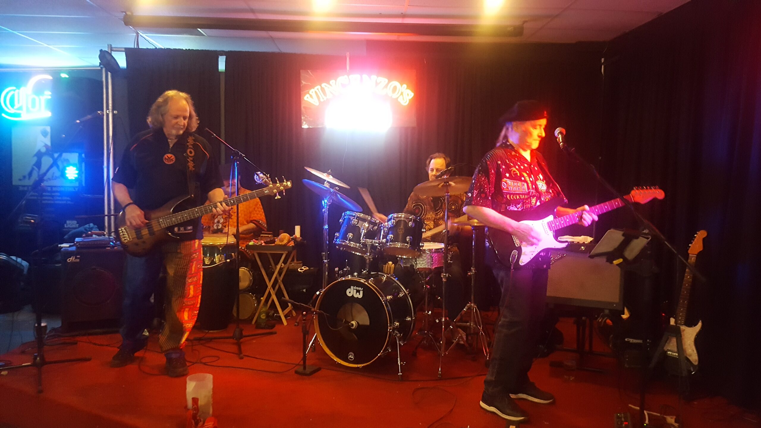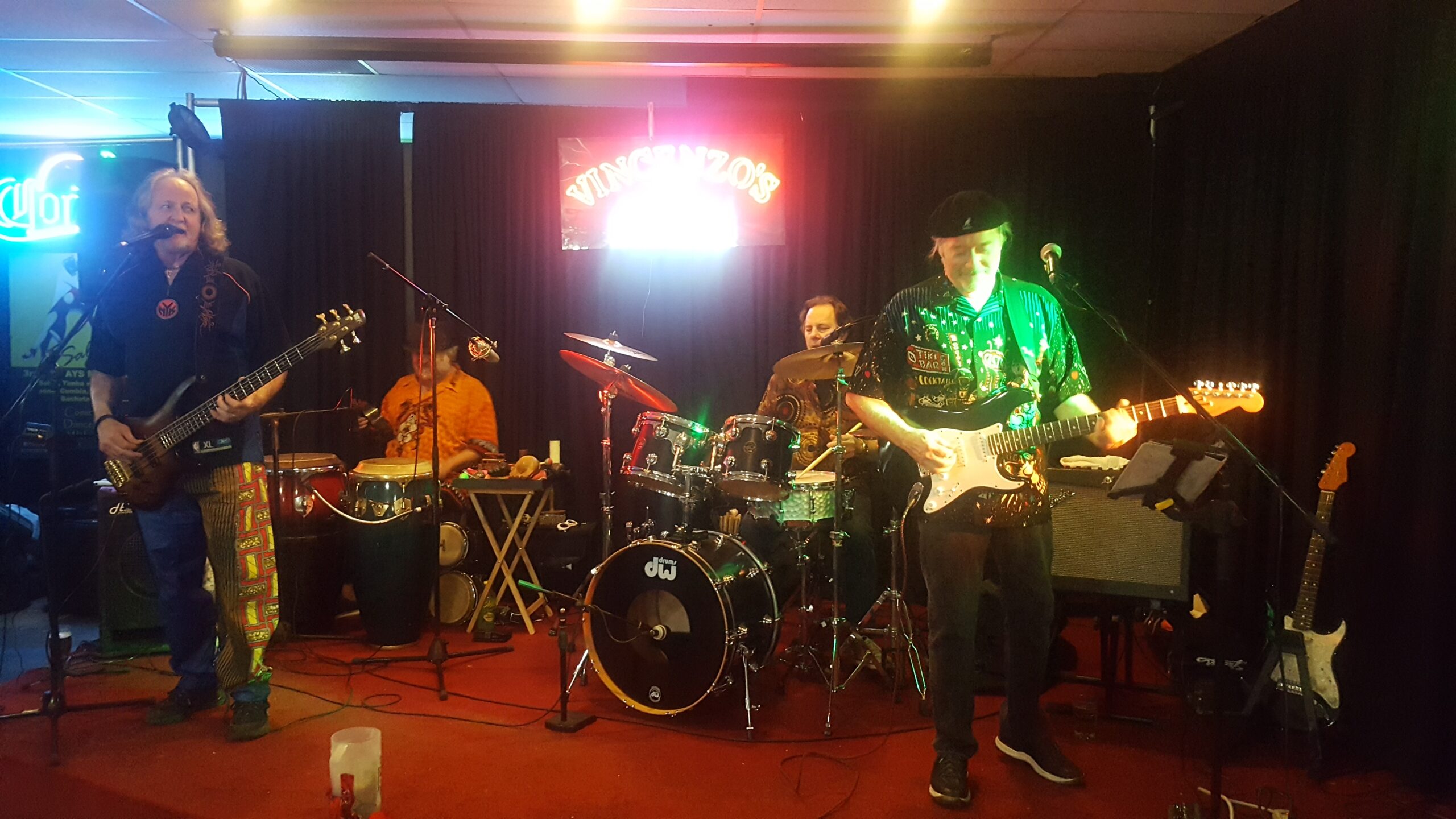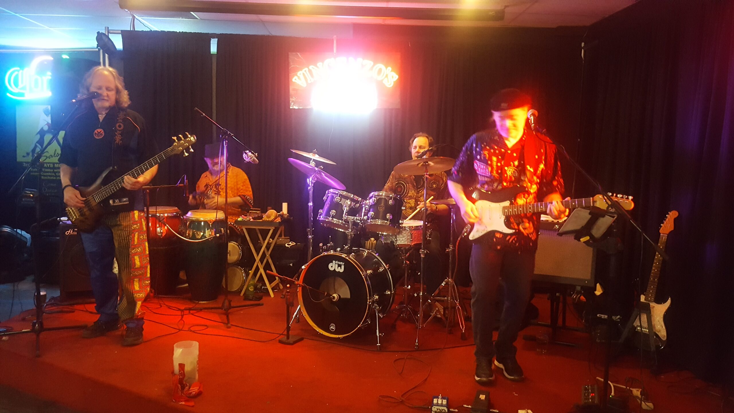 The gallery above has one photo from a retirement party we played, our second to last gig as a band, and the rest are from New Years Eve at Vincenzos Pizza, December 2019. From left to right I am on bass, vocals and harmonica, Steve Reid – founding member of The Rippingtons and Supertramp 1987/8 member is on percussion, then Pete Smith on drums and vocals and Dan Kirkpatrik on guitar and vocals. Steve used to join us regularly during 2018-19.